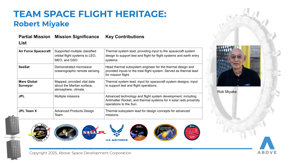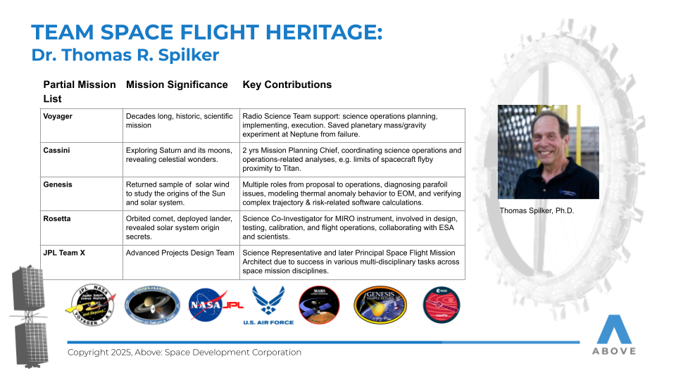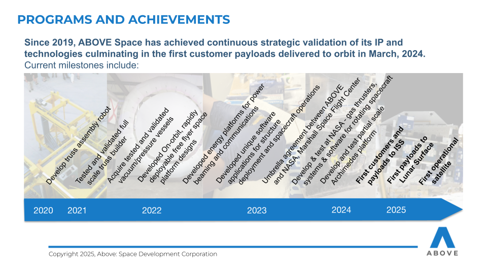 ABOVE features a team with over 50 years of combined space flight experience, including participation in several successful ISS missions, a NASA Space Act Agreement for access to facilities and expertise, successful completion of over $1.8 million in U.S. Air Force contracts, with recognition from DARPA for on-orbit structural technologies.